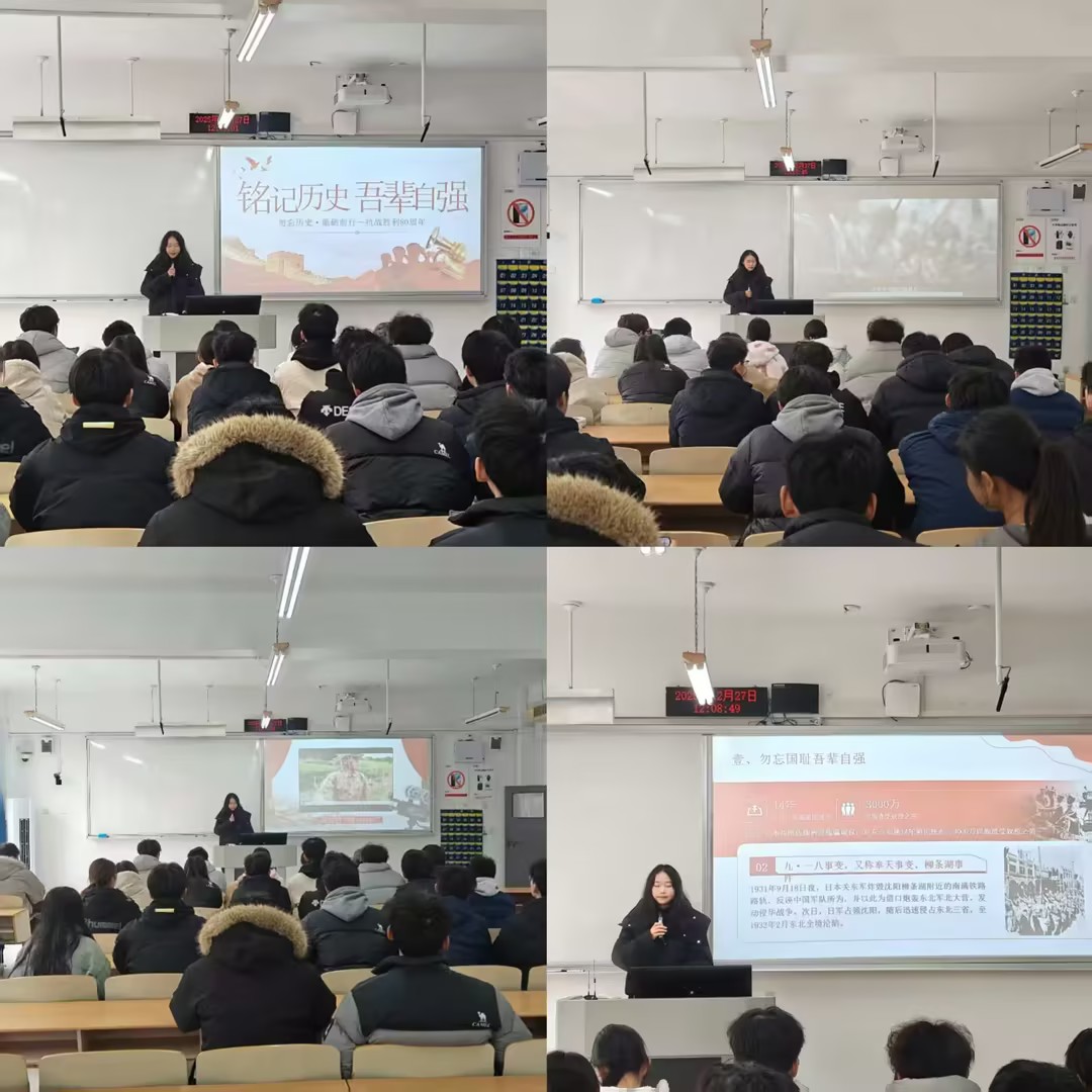 活动现场由学院创新创业部许睿同学担任主讲人。她以抗日战争历史发展脉络为主线,结合珍贵史料与英雄事迹,生动讲述了民族危亡之际中华儿女浴血奋战的峥嵘历程,深刻阐释了“天下兴亡,匹夫有责”的爱国情怀与“视死如归、宁死不屈”的民族气节,让在场同学深切感悟伟大抗战精神的丰富内涵与时代价值。